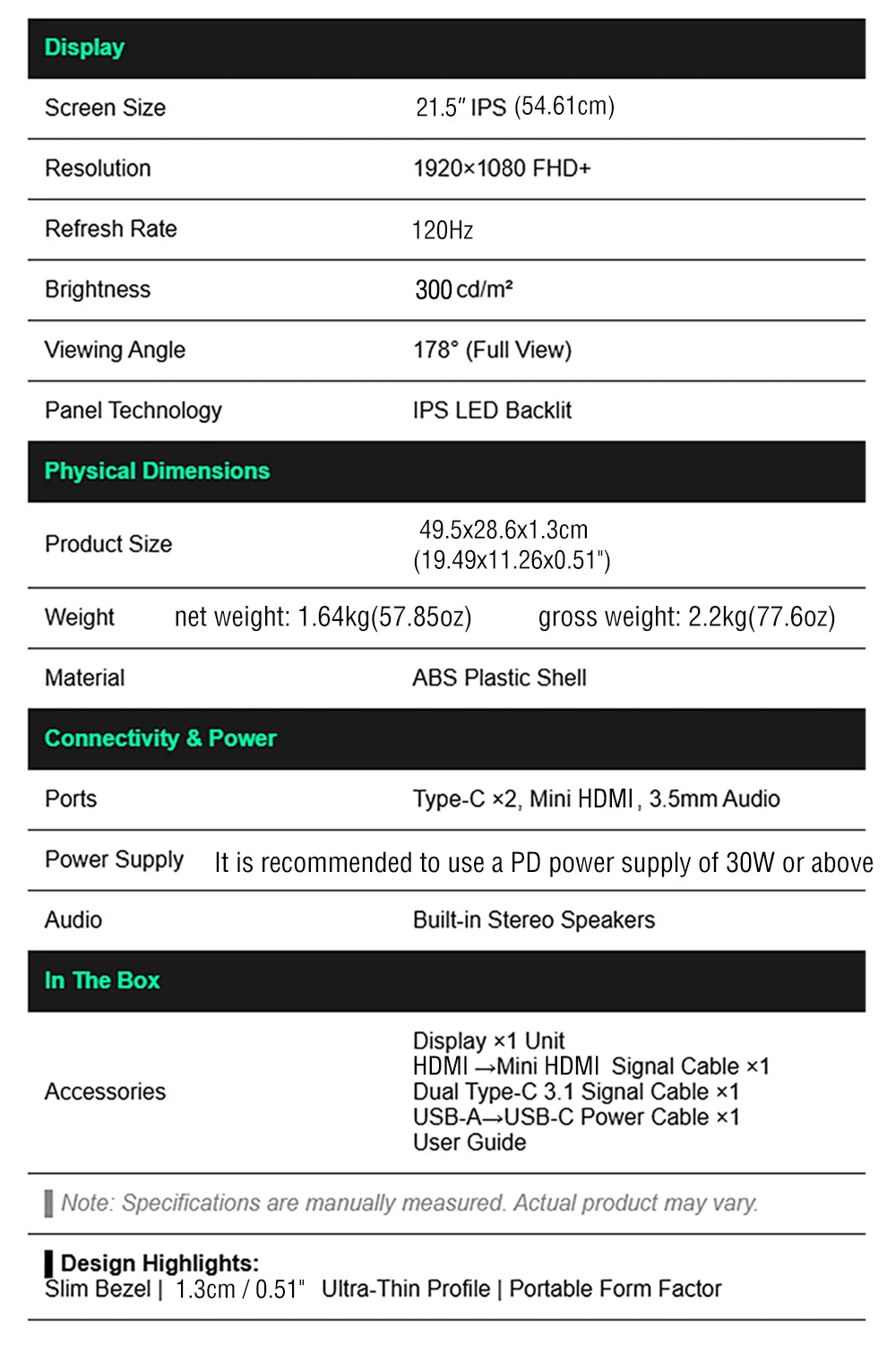 Anmite 21.5 inch Portable Monitor 120Hz RGB100% With VESA Hole & Back bracket Laptop Extended Display ADS-IPS HDR Screen