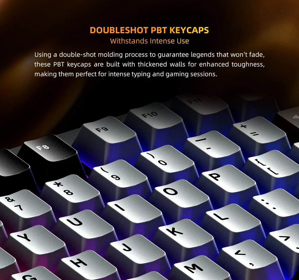 Durable, fade-resistant doubleshot PBT keycaps that stay pristine even with heavy use.