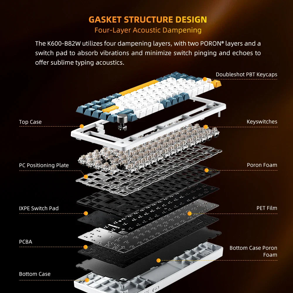 Our gasket-mounted design combined with four layers of internal padding.delivers unmatched typing comfort and acoustic dampening. This thoughtfulconstruction ensures that each keystroke feels cushioned, reducing noise andenhancing your overall experience.