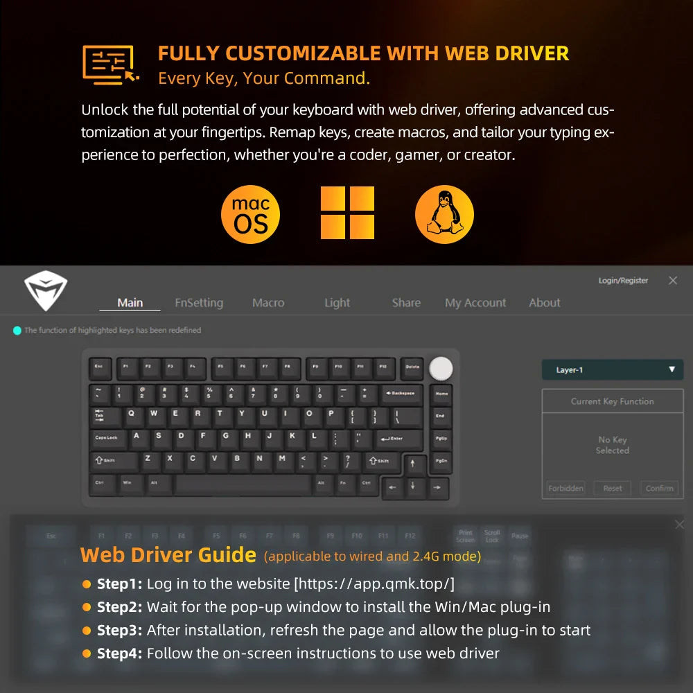 Unlock the full potential of your keyboard with web driver, offering advanced customiza-tion at your fingertips, Remap keys, create macros, and tailor your typing experienceto perfection, whether you're a coder, gamer, or creator.