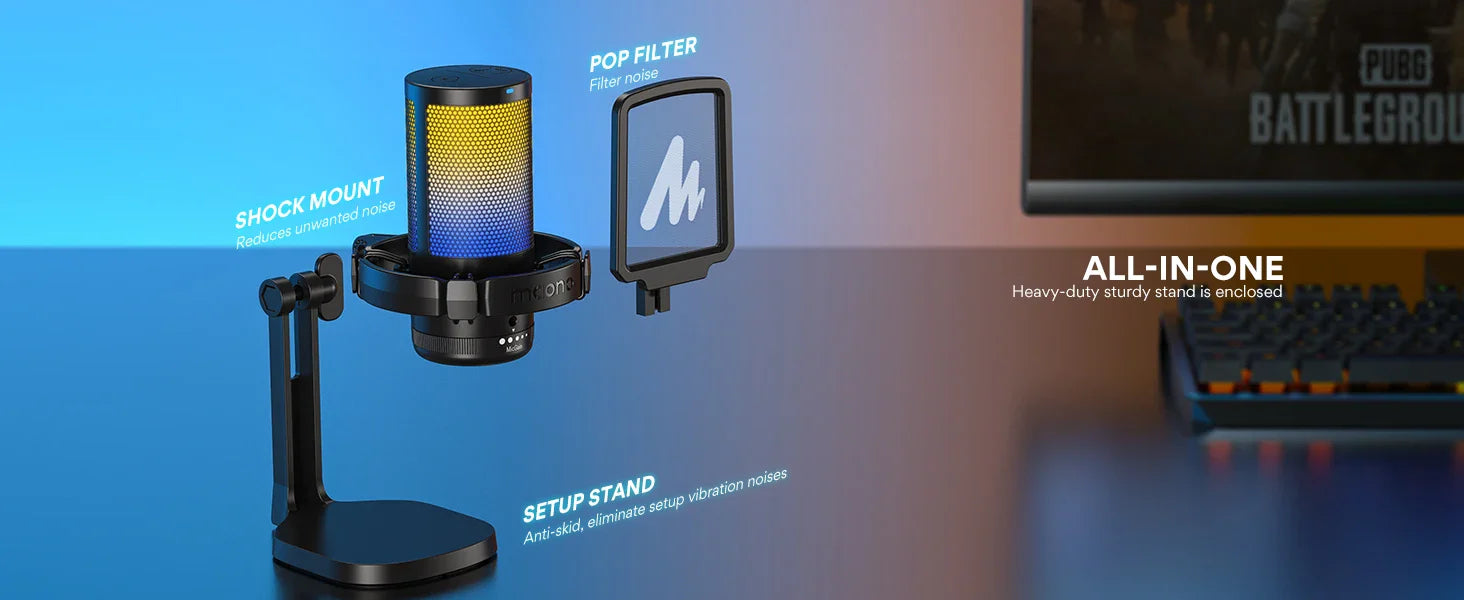 ALL-IN-ONE KIT - Includes USB gaming microphone x1, sturdy stand x1, pop filter x1, shock mount x1, USB-C to USB-A/USB-C cable x1, user manual x1, boom arm adapter x1. This PC mic can fit 5/8" to 3/8" threaded mic stand setups.