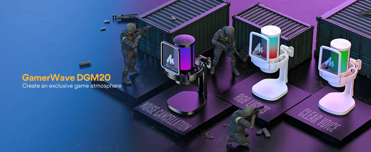 DGM20 Features: ENC Noise cancellation,Controllable RGB lights,Real-time monitoring,One-button mute,Adjustable gain,Includes shock mount and pop filter