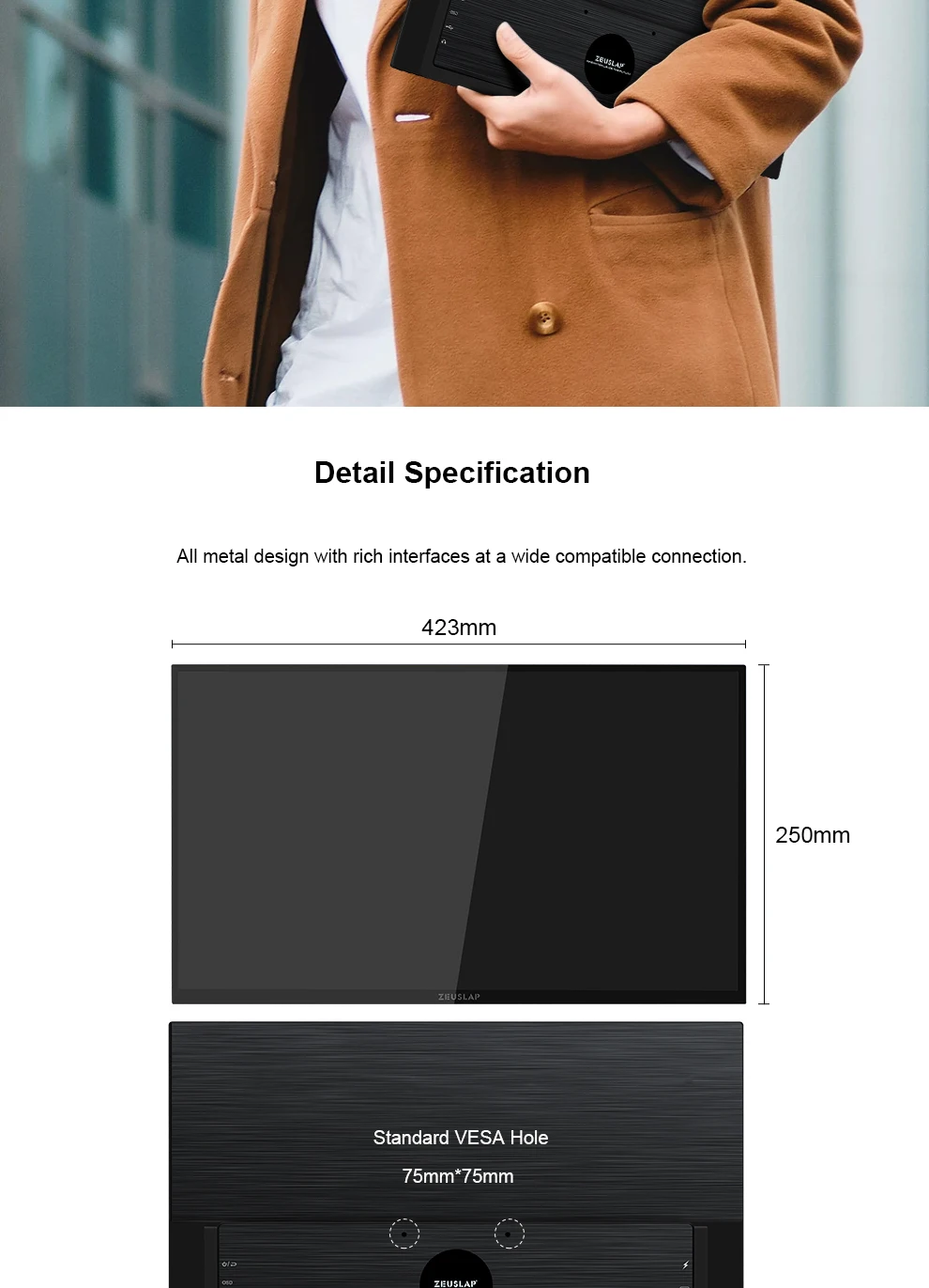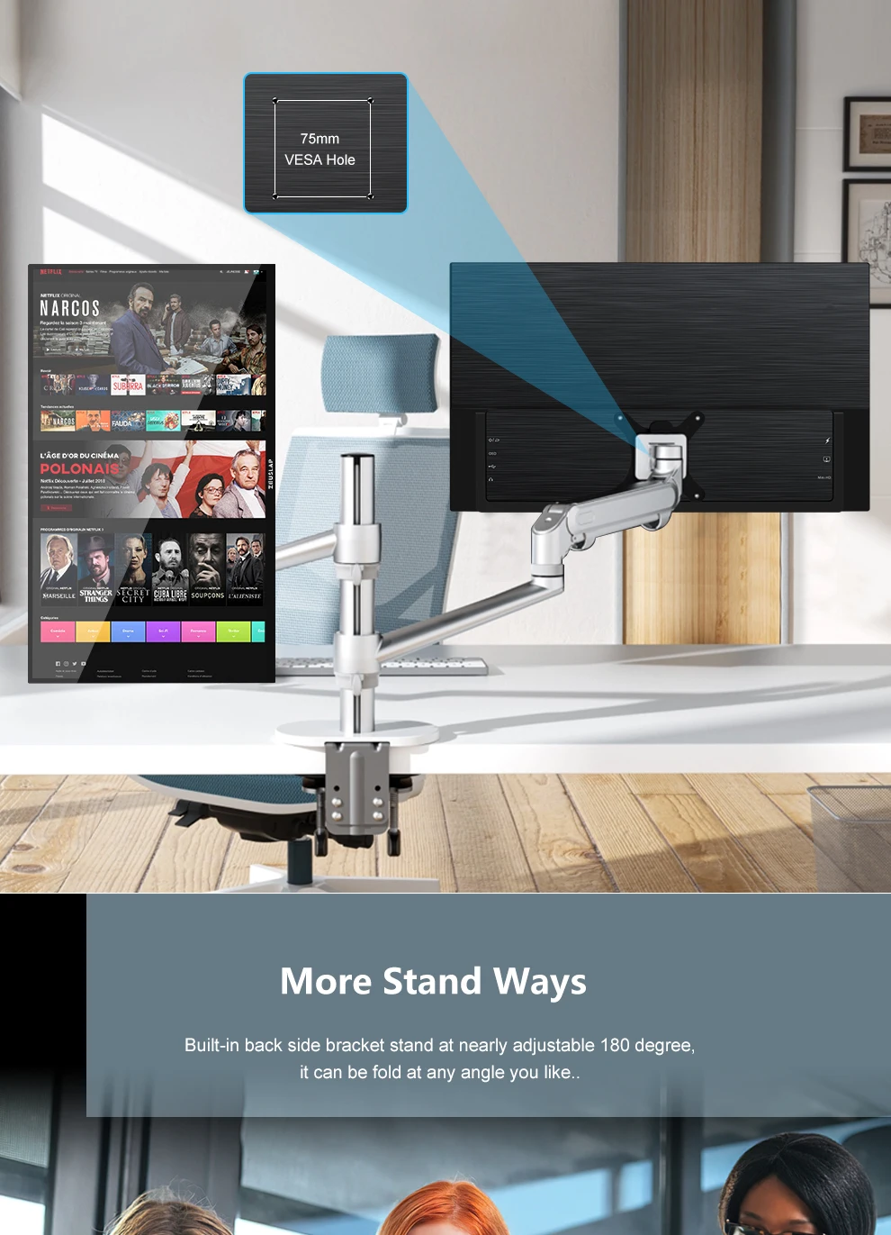 8.Built-in back support bracket for 180° wide angle adjustment as well as standard 75mm*75mm VESA for wall mounted.