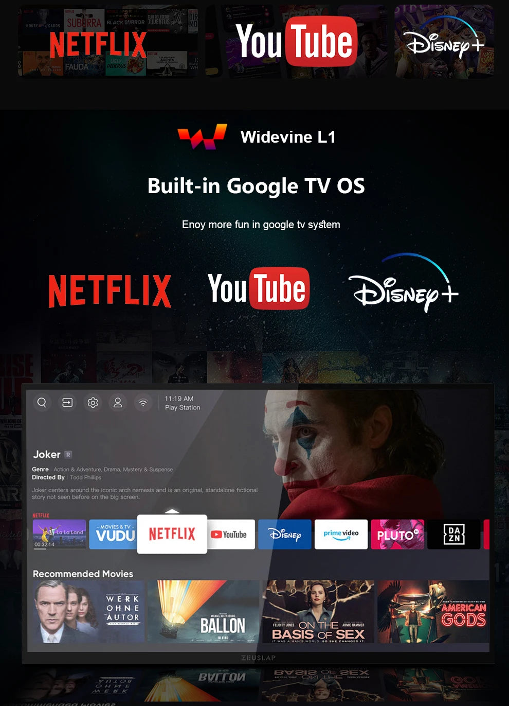 1.Built-in Google TV OS with Widevine L1 licence and support Netflix HD video playing.
