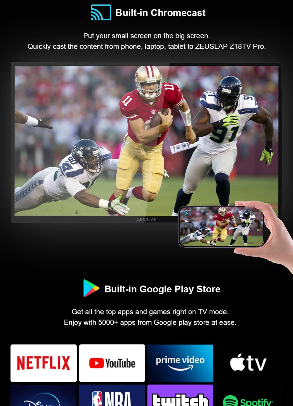 4.Built-in Chrome Cast for wireless connection with phone,tablet and laptop.